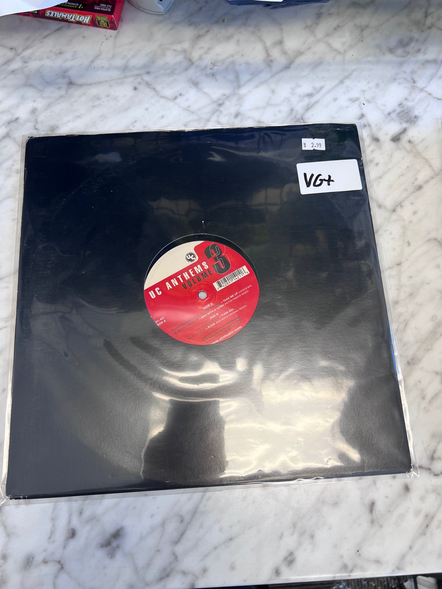 An item in Very Good (VG) condition can be played through without skipping. The item’s defects will be more pronounced. Surface noise will be evident upon playing, especially in soft passages and during a song’s intro and fade, but will not overpower the music. Wear will start to be noticeable, such as with light scratches on vinyl (deep enough to feel with a fingernail) that will affect the sound. Labels, covers, and sleeves may be marred by writing or have tape, stickers, and residue attached. However, a VG item will not have all of these problems at the same time.